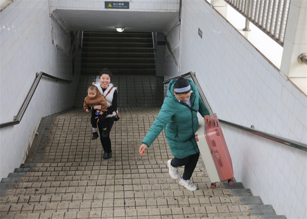 1月31日,在貴州省黔東南苗族侗族自治州施秉火車站,剛下列車的乘客正在出站。(磨桂賓 攝)