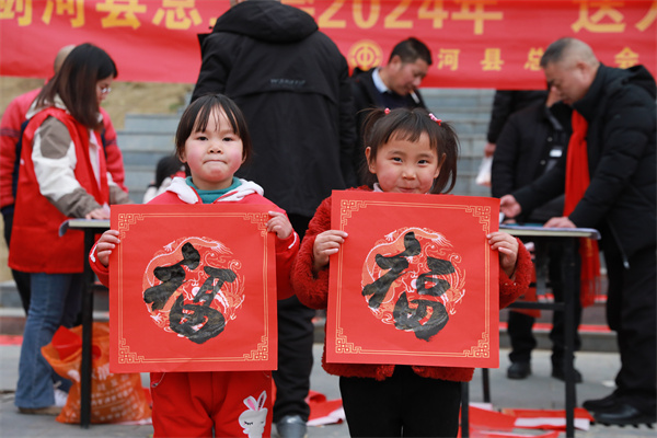 小朋友展示領到的“福”字。楊菊梅攝