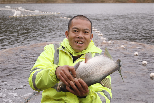 2月2日,黎平縣雙江鎮呂孖村村民展示抓來的白鰱魚。