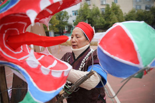 2月2日,苗族婦女在貴州省黔東南苗族侗族自治州施秉縣城關鎮扎龍,為迎新春龍燈會作準備。