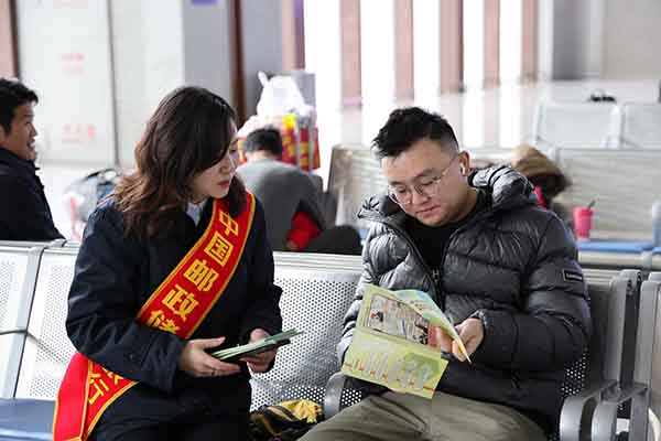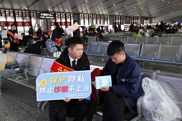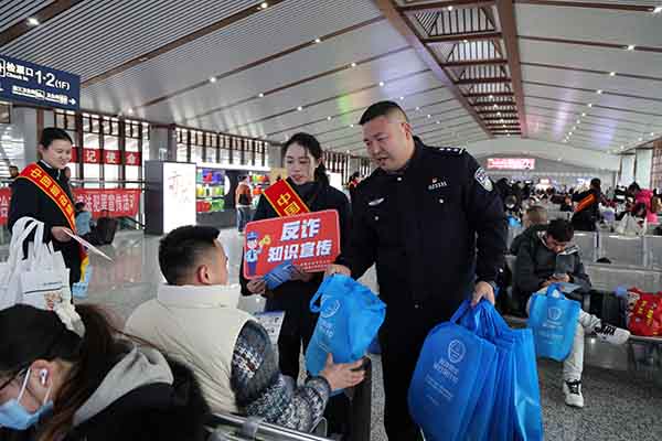 在畢節市高鐵站二樓候車室,郵儲銀行畢節市分行工作人員向候車乘客發放反詐宣傳小冊子、講解反詐知識,並邀約乘客參與反詐知識搶答。同時,候車室語音滾動播報郵儲銀行溫馨提示,檢票口兩旁也分別放置一台電視機,循環滾動播放“全民反詐,我們在行動”“平安春運,謹防詐騙”等反詐相關知識內容,工作人員手持各種醒目的“謹防詐騙” 提示牌,提醒乘客注意防範6種常見的電信詐騙種類。