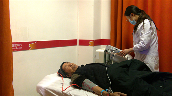 在平塘縣人民醫院國家標準化代謝性疾病管理中心,護士陳陽正在忙碌,為病人進行神經傳導測定、動脈血管硬化檢測,並交代病人注意事項。