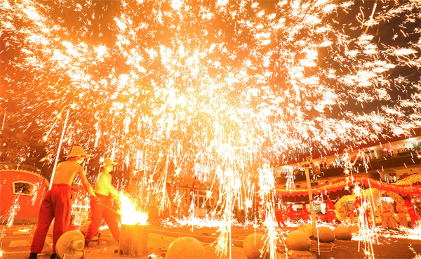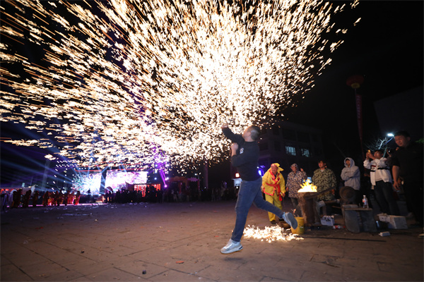 在大方縣六龍鎮,群眾體驗打鐵花。何志剛 攝