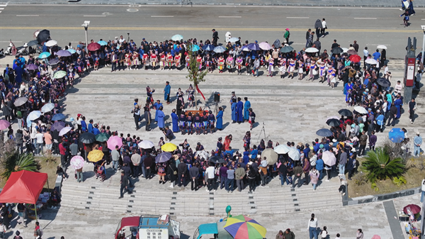 活動現場,高高的“花樹”披紅挂帶立於跳花場中央,苗族同胞按照民俗舉行了“請花樹、栽花樹、敬花樹、跳花樹”儀式。緊接着,亞魯王史詩唱誦、竹王崇拜《遷徙舞》、花山布依古歌、布依族民歌以及貓營地戲表演等輪番上演,苗族同胞們用歌曲、舞蹈、民族樂器演奏等群眾喜聞樂見的表演形式,與觀眾來了一場新春大聯歡,現場一片歡騰。