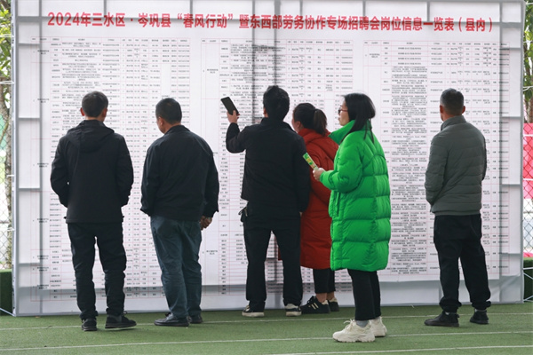 求職者在貴州省岑鞏縣舉行的專場招聘會上了解崗位信息。(唐鵬 攝)