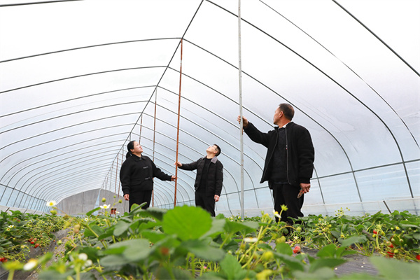 農技人員和農戶一起查看種植大棚的加固情況。彭郡攝