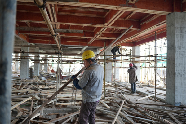在該項目建設工地,工人們正搶抓晴好天氣,忙着對已完成主體結構的教學樓進行模板拆除及內外墻磚砌築。