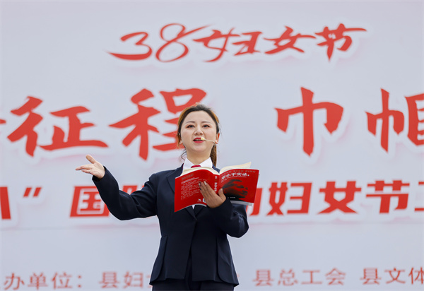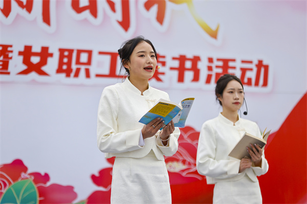 3月7日,在貴州省黔東南苗族侗族自治州施秉縣城三角洲廣場,女職工在參加“迎三八”讀書活動。