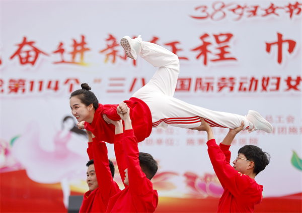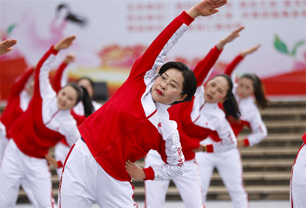 3月7日,在貴州省黔東南苗族侗族自治州施秉縣城三角洲廣場,女職工在參加“迎三八”工間操比賽。(磨桂賓 攝)