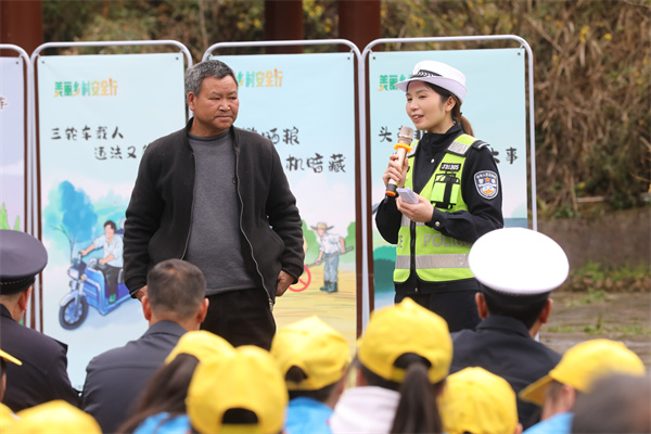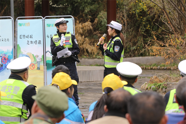 此次活動以群眾喜聞樂見的“壩壩會”形式開展,黔南民族師範學院副教授、平塘縣卡蒲鄉新關村駐村第一書記、平塘縣交通安全公益宣講人裴會敏用通俗易懂的語言宣講農村交通安全出行,倡導廣大農民朋友關注交通安全,自覺遵守交通法規,抵制交通違法,摒棄交通陋習。平塘縣公安交通管理局車管所民警對報名參加摩托車考試的群眾進行考前培訓,詳細講解摩托車考試的流程和注意事項。省公安廳交通管理局宣傳處王佳老師就農村交通安全話題開展有獎競答,現場群眾積極參與互動,在與父老鄉親們互動交流中,“知危險 會避險”的交通安全理念更加深入人心。活動現場,鄉親們唱起毛南山歌。“平安出行第一條,交通安全要記牢。一盔一帶心中記,安全騎車排第一……”一條條交通安全警句從歌聲中流淌出來,蕩漾在風情園的上空。在主持人王佳的帶領下,現場幹部群眾、學生代表一起宣讀交通安全倡議書,引發大家對交通安全的共鳴。