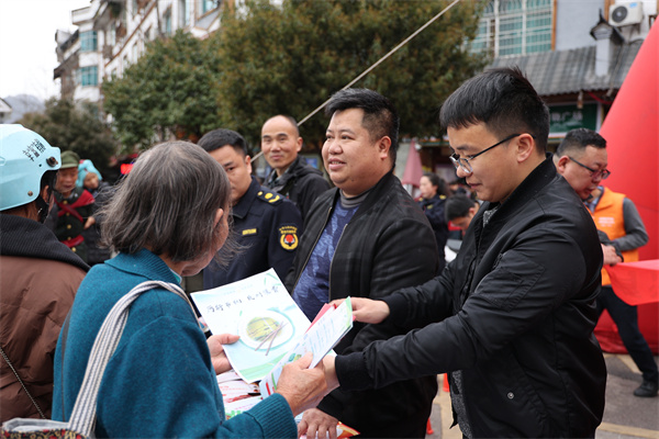 工作人員向過往群眾發放宣傳資料。(黃義雙攝)
