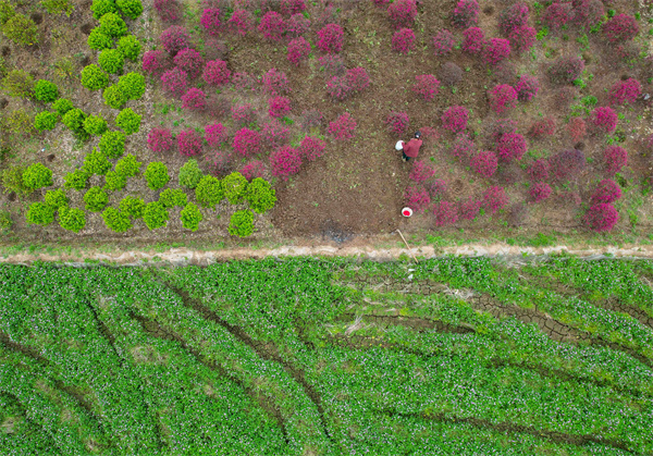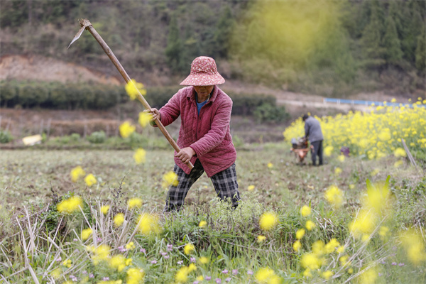 3月26日,農民在貴州省黔東南苗族侗族自治州施秉縣楊柳塘鎮地壩村田間勞作。(磨桂賓 攝)