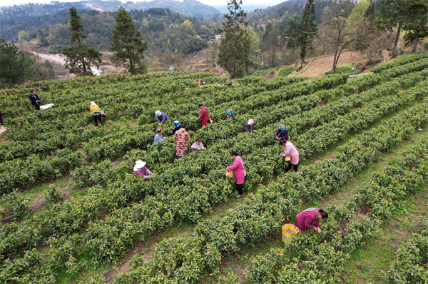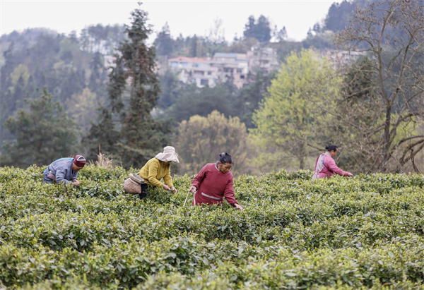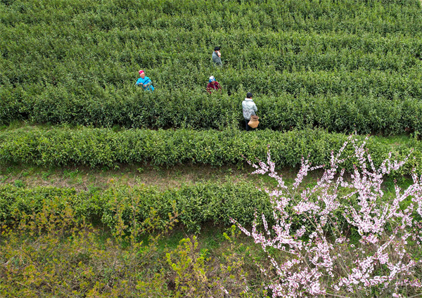 3月26日,農民在貴州省黔東南苗族侗族自治州施秉縣甘溪鄉高碑村採摘春茶。
