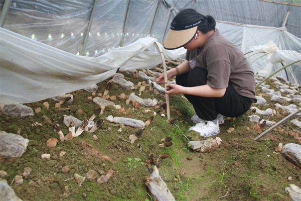群眾在黃義清的羊肚菌基地采收最後一茬新鮮羊肚菌。(鐘勇 攝)
