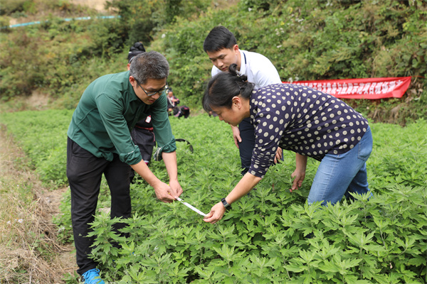 科技特派員與專家正在對艾草進行測産。(劍河縣融媒體中心供圖)