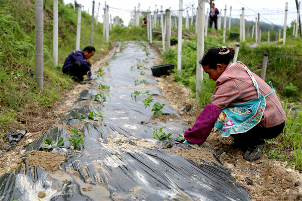 “他們五個在前面栽苗,我們就插纖上橋,他們還要捆苗,不允許它掉在地上,掉在地上油紙一燙苗就會蔫,我們像這樣相互配合一天可以栽兩千多。”基地工人勾光美説。