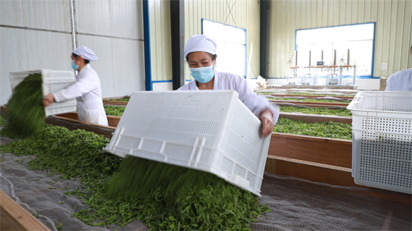 在位於丹寨縣金鍾經濟開發區的一家茶葉加工廠內,攤晾機、揉捻機、炒制機等20多台機器正在高速運轉。幾十名工人分工明確,對鮮葉進行攤晾、殺青、揉捻、提香、塑型、包裝等,濃濃茶香瀰漫在整個車間。從進入4月以來,村民楊貴榮就奔波於茶園和工廠之間,每天確保將批量的鮮葉運送至茶葉生産一線進行及時處理。茶葉配送員楊貴榮説:“一天送兩趟到三趟,多的有一千多斤,少的也有兩三百斤。”
