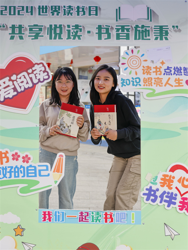 4月22日,兩位顧客在貴州省黔東南苗族侗族自治州施秉縣全民讀書活動書市購書打卡。(磨桂賓 攝)