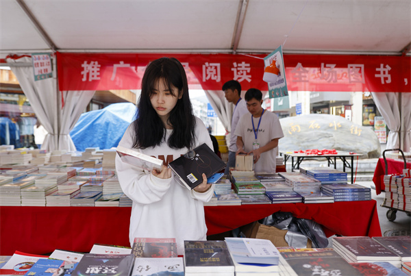 4月22日,顧客在貴州省黔東南苗族侗族自治州施秉縣全民讀書活動書市選購書籍。(磨桂賓 攝)