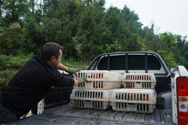 養殖戶正在給裝好的雞裝車。(何小雨 攝)