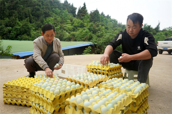 微風和煦,走進位於天星鄉天星村的岑鞏縣敬成養殖場,一個個綠色養雞棚在林間排列,耳邊時不時傳來清脆的雞鳴,雞蛋泡沫包裝盒在院子裏平地而放,打包、盤點、裝車,戚澤梨一家人正忙得不亦樂乎。