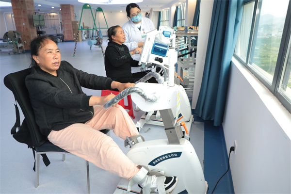 在岑鞏縣中醫醫院康復訓練室,就醫群眾楊彩雲(左一)在進行康復訓練。(李昌焯 攝)