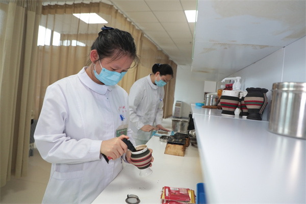 在岑鞏縣中醫醫院針灸康復科治療室,護士們正在準備藥敷、藥物罐。(李昌焯 攝)