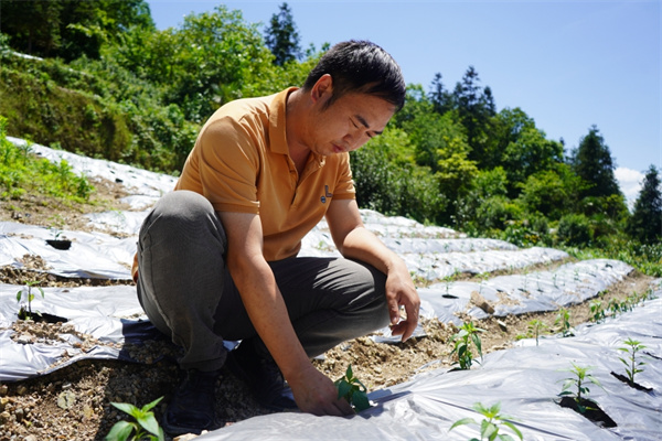 龍田鎮龍溪村村民夏昌明在查看種植的辣椒。(周燕 攝)