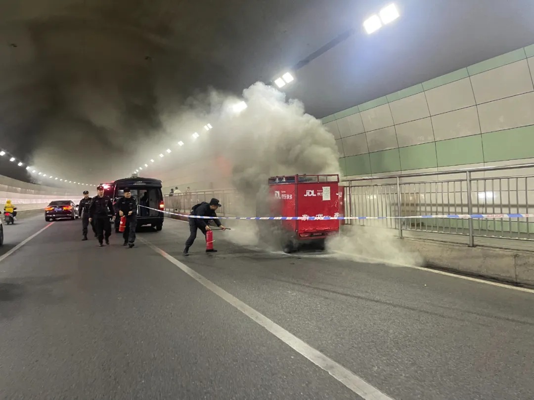一週前的一個中午,余進像往常一樣開展車巡工作,卻發現一個隧道內情況異常:一輛運送快遞的三輪車起火,冒出濃煙。