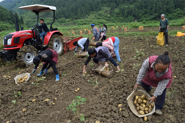 在米坪鄉伍寨村馬鈴薯種植基地,正在機械化收穫100余畝馬鈴薯。“突突突……”農機手熟練地操作着馬鈴薯收穫機,隨着機器掀土、抖動,一個個帶着泥土芬芳的馬鈴薯翻滾而出,農戶緊隨其後忙着分揀、裝袋,短短1個小時,一大片的馬鈴薯完成了采收、裝袋。