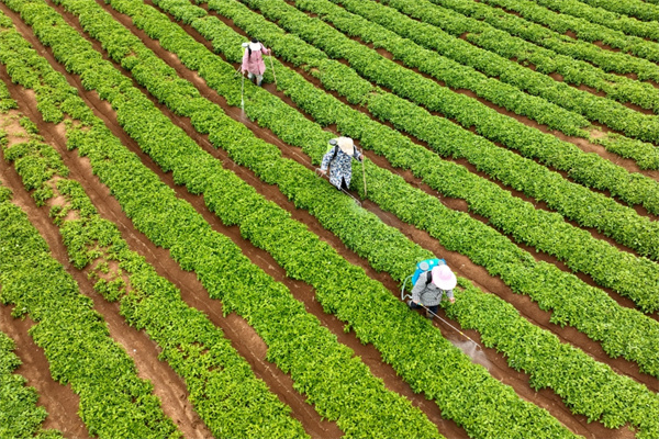 眼下,正值中藥材生長進入夏管的關鍵期,在貴州省岑鞏縣天星鄉三星村的太子參基地裏,一片綠意盎然,綠油油的太子參,長勢非常喜人,10余名工人正忙着噴灑農藥,田間地頭,呈現一片“熱辣滾燙”景象。