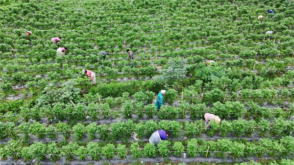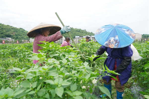岑鞏縣客樓鎮安山村辣椒種植基地,村民們在行壟間開展除雜草工作。(陳昆 攝)