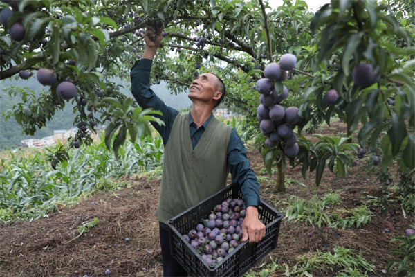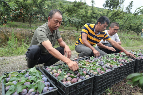 在岑鞏縣注溪鎮岑王村五子園精品水果種植基地裏,果農們在採摘新鮮李子。(李昌焯 攝)