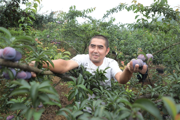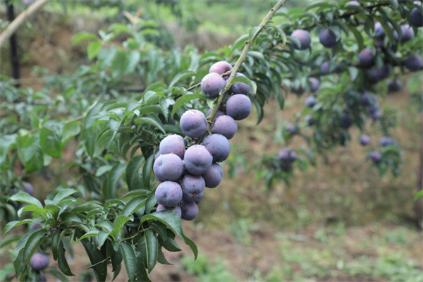 在岑鞏縣注溪鎮岑王村五子園精品水果種植基地裏,圓潤飽滿的李子綴滿枝頭。(李昌焯 攝)