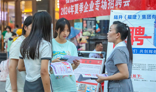 各招聘展&上,工作人員早早地將招聘信息張貼起來,諮詢&上放着宣傳彩頁。招聘現場,求職者認真閱讀招聘信息,工作人員熱情地向求職者介紹工作崗位、薪資待遇等情況,並邀請有意向人員填寫求職登記單。