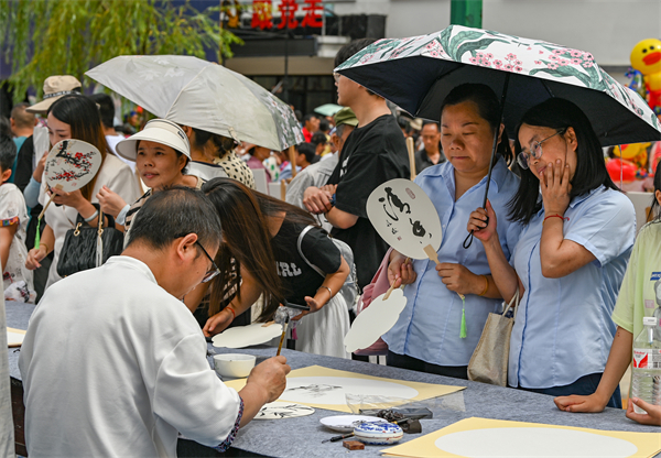 7月11日,貴州省黔西市五里鄉中心村,書法愛好者為群眾畫扇子。張晶 攝