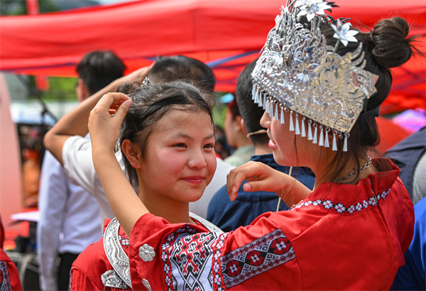 在協和鎮仡仲村,各民族同胞歡聚一堂開展籃球比賽、掰手腕、扭扁擔、唱敬酒歌等活動。隨後,布依族歌舞、樂器獨奏、小品等文藝節目輪番上演,現場精彩不斷、掌聲雷動。