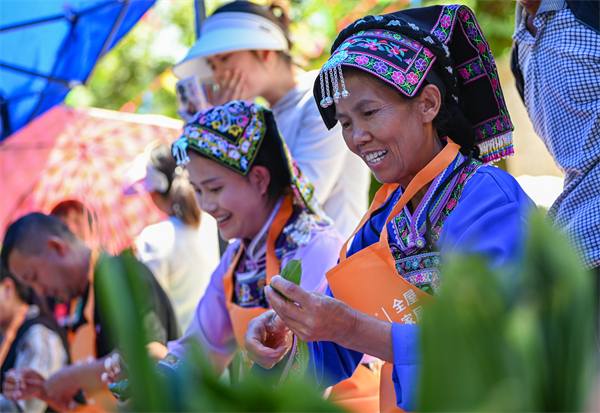 7月11日,貴州省黔西市鍾山鎮貓山村舉辦“六月六”民俗活動,當地布依族同胞在包粽子。侯進勇 攝