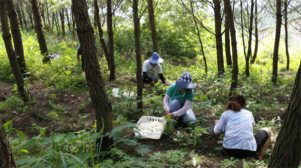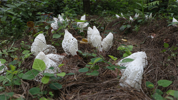 這幾天,在九阡鎮水各村紅托竹蓀種植基地裏,茂密的樹林下,密密麻麻的紅托竹蓀撐開白色的“裙擺”在風中搖曳,散發陣陣清香。村民們正小心翼翼地將成熟的紅托竹蓀從泥土中採摘出來,放入籃筐,現場呈現出一派豐收的忙碌景象。
