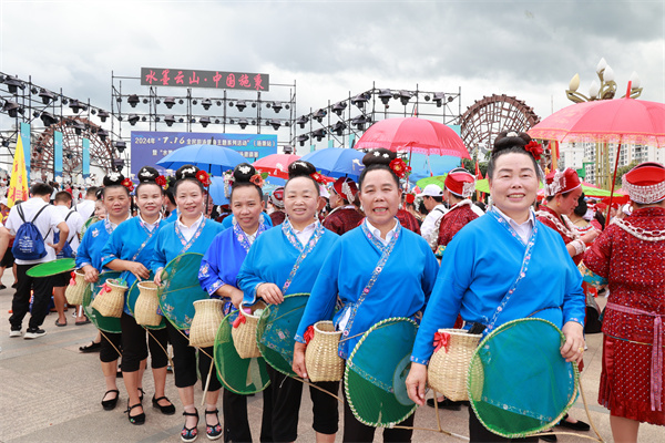 當天上午,來自州內兄弟縣市的盛裝姑媽隊和游泳隊員們一路沿街游行,在熱鬧的氛圍中,展示民族歌舞和運動風采,接受市民和游客的“檢閱”。