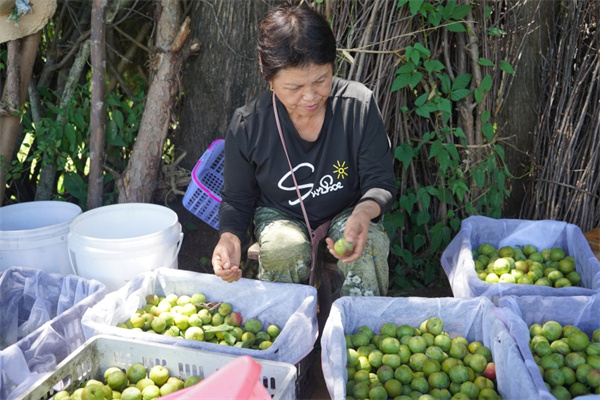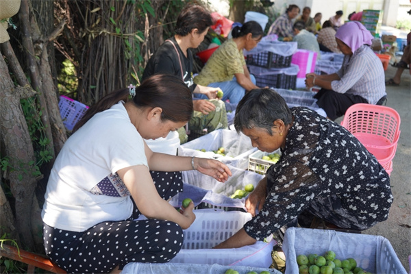 村民正在果園旁邊的樹蔭下分揀、包裝蜂糖李。(程雪華 攝)