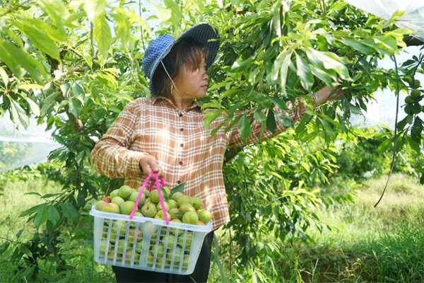 手一招,一顆顆青脆飽滿的李子像是變戲法似的很輕易地便從樹上到了張承鋒的籃子裏,因為李子富含維生素C、鈣、鐵和多種氨基酸,再加上合作社出産的李子個大肉實、果肉細膩、汁多味甜、口感絕佳,所以深受市場青睞。