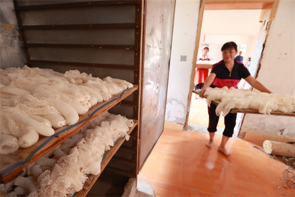 “我們這個竹蓀種植是由我們公司提供菌種,並在種植、採摘、烘烤方面等提供全程技術服務,我們的鮮菇150元每斤,幹品能賣到300元,市場不愁銷路,有多少可以銷多少。”貴州菌都匯生物科技有限公司技術員倪玉善介紹説,鮮菇主要銷往周邊縣市,烘烤後的幹品主要銷往廣東、福建等沿海地區。