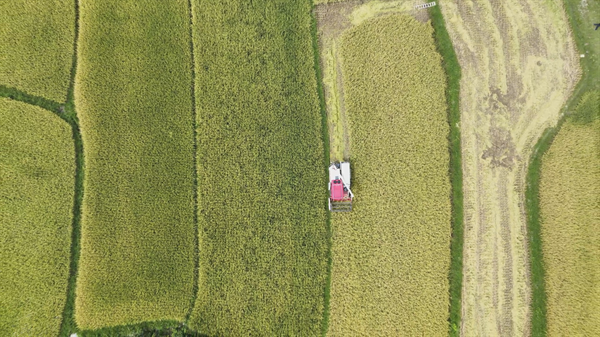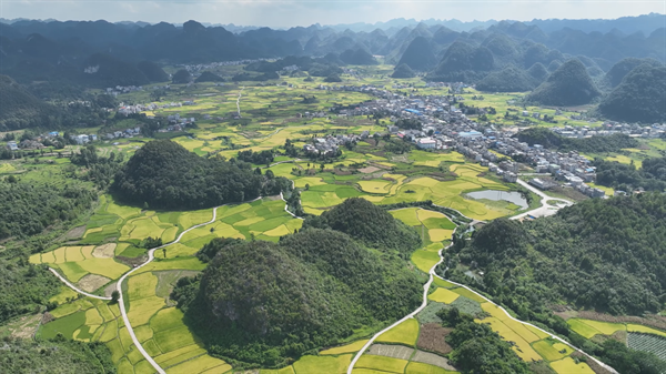 從空中俯瞰,作為平塘縣糧食主産區之一的四寨壩區大米種植示範基地披上了金色的盛裝,金黃的稻穀搖曳在秋風中,一串串飽滿的稻穗壓彎了稻桿,空氣中散發着陣陣稻香。