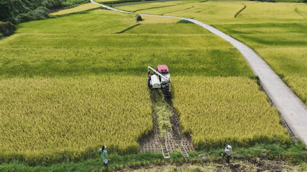 村民林麗是者密鎮和平村水稻種植大戶,趁着晴好天氣,她和丈夫駕駛着收割脫粒一體的大型收割機穿梭在稻田間,隨着撥禾輪的轉動,顆粒飽滿的稻穗隨即被收入囊中,看到機械化收割帶來的高效率,林麗喜上眉梢。