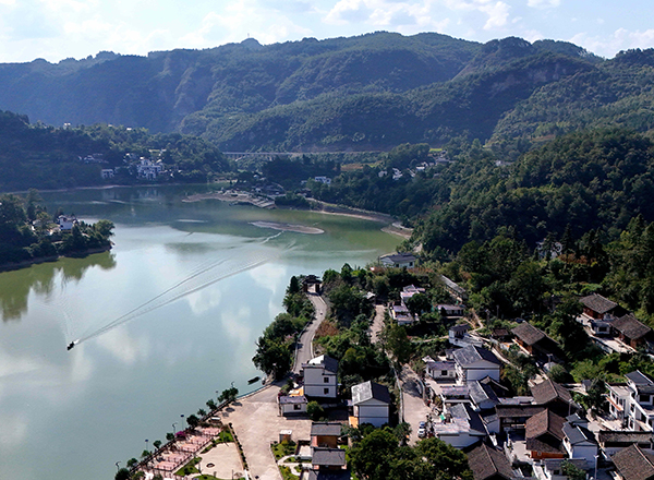 8月21日拍攝的黔東南州施秉縣高碑湖畔“水雲澗”民宿(航拍圖片)。