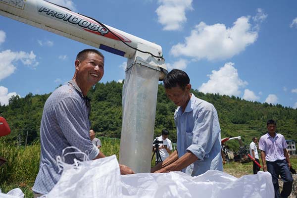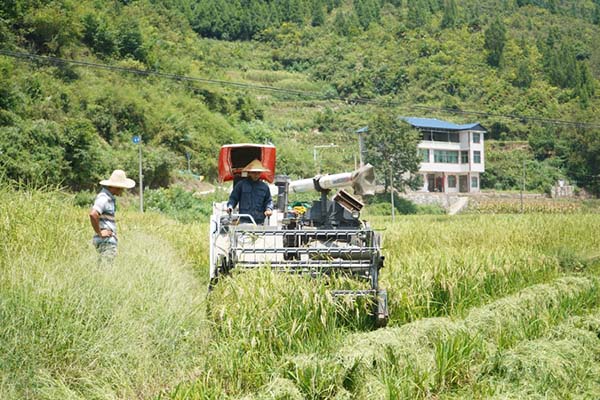 岑鞏縣天星鄉地城村水稻制種示範基地,收割機正在收割稻種。(何小雨 攝)