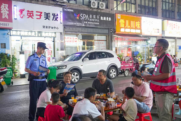 “網上有人喊你投資,説包賺不賠一定有問題,代買代購拿提成要注意……”近日,在岑鞏縣㵲水街道河濱廣場,岑鞏縣公安局新興中心派出所的民警正帶着幾位熱心群眾在夜市裏向市民宣傳反詐知識,併發放相關資料,和他一起來宣傳的熱心群眾正是通過“岑義警務”招募的義警隊員,他們共同為當地居民帶來了一場生動的法治課。