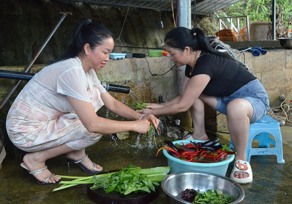 游客在山莊洗菜做飯。(吳鈺瑩 攝)