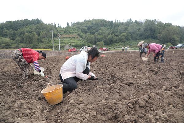 岑鞏縣客樓鎮白家壩村百合種植基地,群眾在栽種百合。(沈啟照 攝)